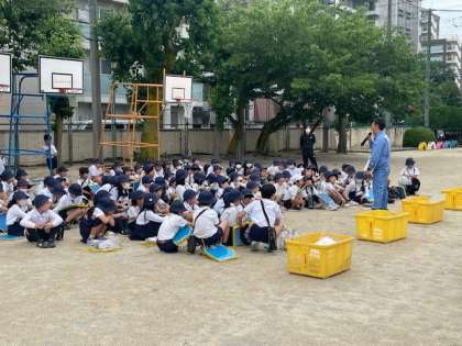 今日の2時間目、4年生が社会科の出前授業でパッカー車体験をしました。