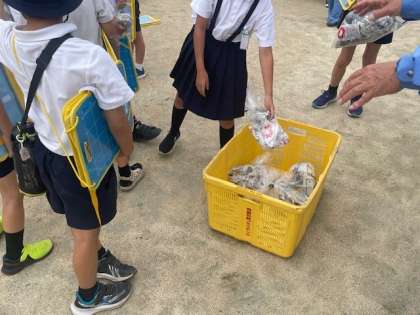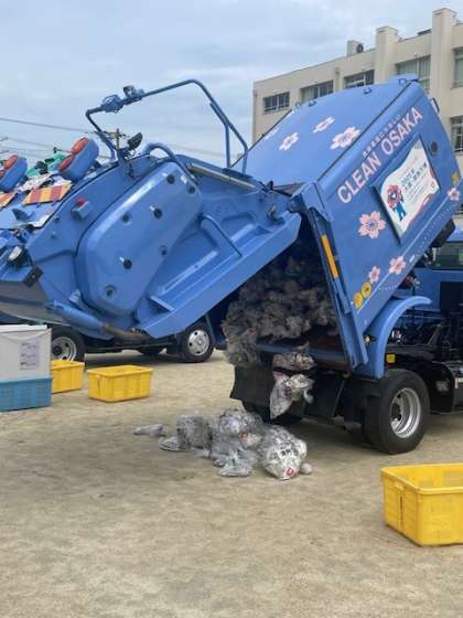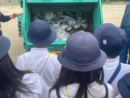 次は、実際にパッカー車にごみを入れる、という体験です。各自用意したごみ袋をかごに集め、パッカー車に投入すると次々にタンクの中に入っていきます。その後には、収集したごみを焼却工場で投入する方法も見せていただきました。日頃は見られない光景に、驚きの声が上がっていました。