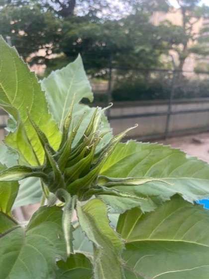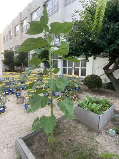 学習園に植わっているひまわりが、ぐんぐん成長しています。気がつくと2mを超えています。先端では花を咲かせる準備も着々と進んでいます。