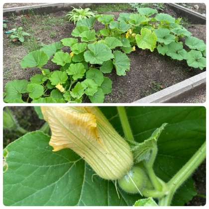 また、その足元ではカボチャも元気につるを伸ばして、花を咲かせています。雌花の根元には実の姿も…。