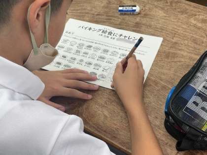 はじめは、前に掲示された食品から好きに4点選んで給食メニューを考えました。バイキングということで、スイーツとフルーツだけのものや炭水化物多めのものなど、素直に自分の好きな料理を選ぶ子もたくさんいました。中には、ラーメン、から揚げ、エビフライ、デザートといった何ともうらやましいメニューを選ぶ子もいました。