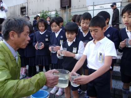 11月29日(金)城北川、にこれまで教室で育ててきた「もつご」を放流しました。一人1匹ずつ、樋を使って流し入れました。