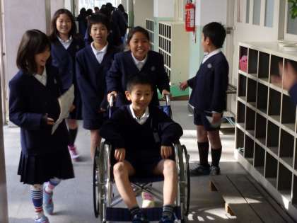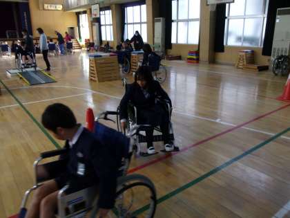 12月3日(火)大阪市立リハビリテーションセンターの方、9名に来ていただいて、4年生の児童が講堂や廊下、運動場を使って、車いす体験をしました。坂道や段差がある時、どうすればいいのかということがわかりました。実際に自分で乗ってみて感じたこと、友だちを乗せて押したことを、貴重な経験として持っていてくださいね。
