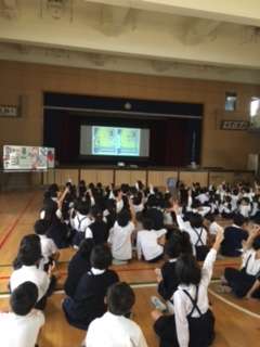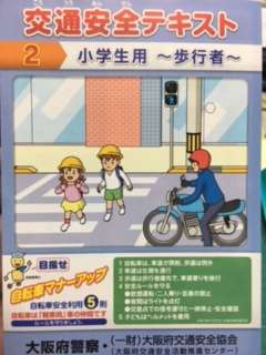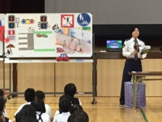 今日の2時間目に1.2年生合同で交通安全教室を警察の方にしていただきました。