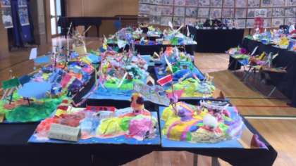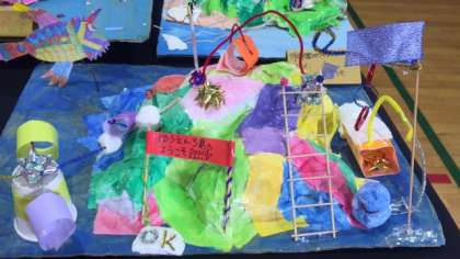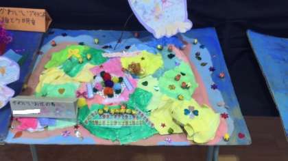 3年生はダンボール、新聞紙で不思議な島を作りました。