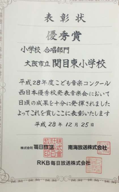 合唱クラブが年末の「毎日放送」主催の「こども音楽コンクール西日本優秀校発表音楽会」で「優秀賞」を受賞しました。