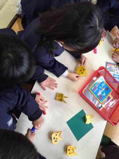 講堂では、折り紙、お手玉、めんこ、あやとりを教えてもらいました。