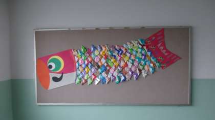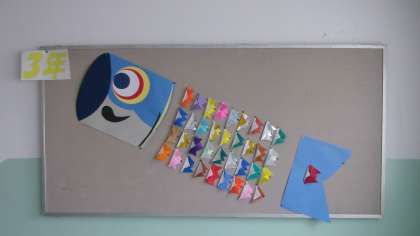 学年みんなでおおきなこいのぼりを作りました。うろこの部分はよく見ると一つひとつが兜になっています。一人一つの作品を作るのもいいですが、このようにみんなで協力し合って一つのものを作ることもいいなと感じる作品になりました。