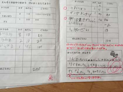「うまいぼうとたべっこどうぶつは、ねだんをけいさんしてみて200円いじょうかからなかったからよかった。」