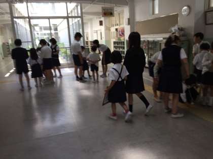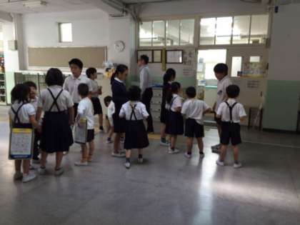 1年生が6年生に連れられて、「学校探検」をしていました。