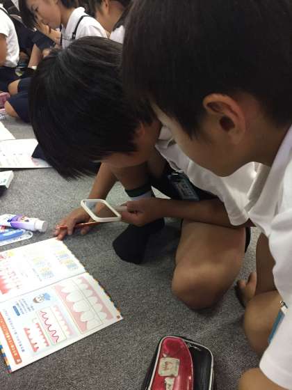 手鏡で自分の歯や歯茎のようすをチェックして、正しい歯のみがきかたを学びました。