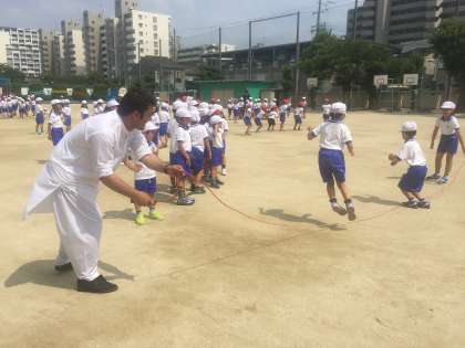 大縄跳びの「郵便やさん」「八の字」を一緒にしました。