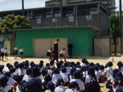 城東消防署の消防士さんに来て頂き、避難訓練をしました。