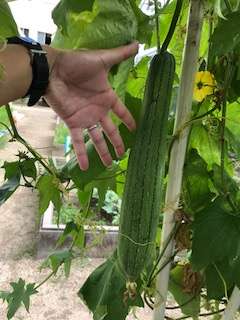7月も終盤。今朝、ヘチマを見に行くと大きな実がたくさん!!1番長いので40cmクラス。2学期始まる頃には何cmになるんだろうね。