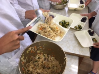 焼きそばは盛りつけがむずかしいですが、5年生のあるクラスでは上手にできていました。さすが高学年!