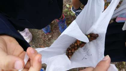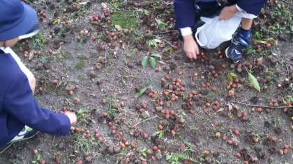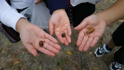 23日、1時間目から3時間目まで、鶴見緑地公園へ行き、どんぐりや落ち葉などを拾って帰ってくることができました。