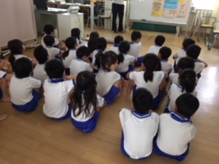 はじめに、保健室はどんなところなのか先生からお話があり、子どもたちはおとなしく座って聞いていました。