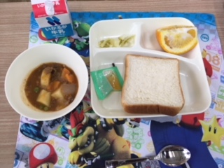 ビーフシチューのなかに、ハートの形のにんじんが入っている児童もいて、