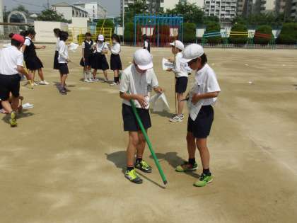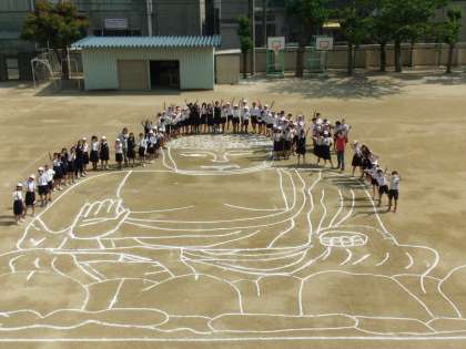 社会の歴史学習で、奈良・東大寺の大仏の実際の大きさを実感してみよう。という試みで、運動場に原寸大の大仏を子ども達が描きました。最後に目を校長先生に入れていただき、開眼式も終えました。実際の大きさを、どう感じましたか?