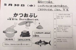 給食では、かつお節をだしを取るのに使ったり、おひたしにかけたり、炒めものやあえ物に加えたりしています。