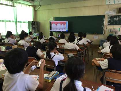 日本学校医師会とライオン株式会社が作ったDVDを見ながら、「歯肉炎」や「歯垢のつきやすいところ」「歯磨きのステップアップ」について学びました。