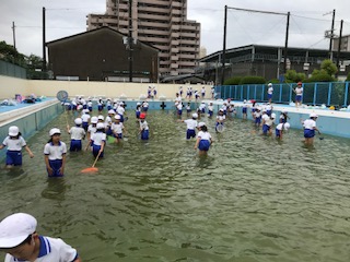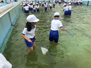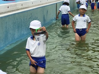 プールの中に入ると、「うわぁきもちわるい」「きゃーつめたい!」など反応は様々。