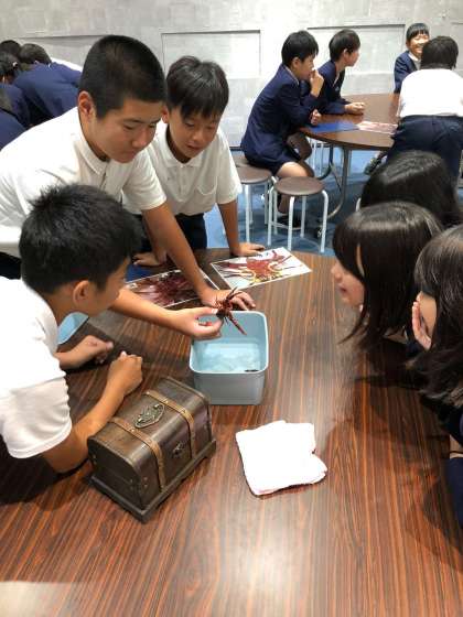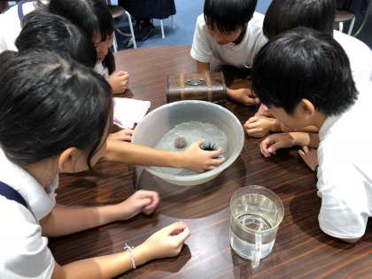 「生きもん!発見教室」にて、ウニとザリガニの生態について学習しています。楽しんで学習しています。