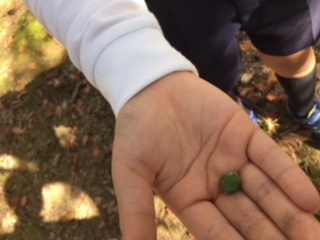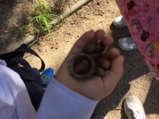 「せんせい、どんぐりがいっぱいある!ぼうしがついてる!」