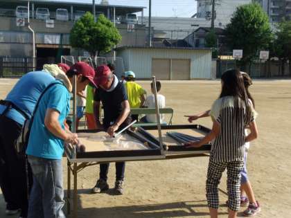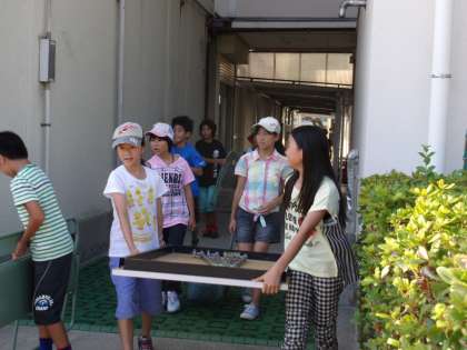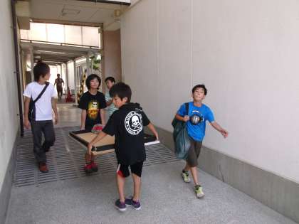 自分たちで、机やテーブルを運んで、夕食の用意です。