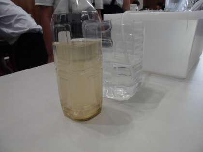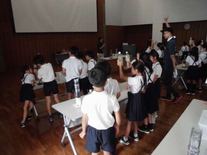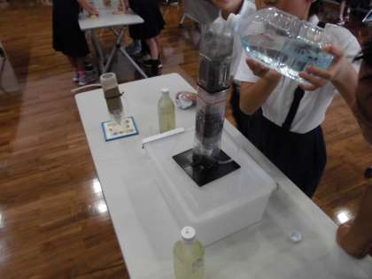 浄水場を見学した後は、室内でどのようにして水がきれいになっていくのか実験をしました。うすく濁って、においもある水を砂ろ過すると透明な水に、でもまだにおいは残っています。次に、活性炭ろ過するとにおいも気にならなくなりました。一つの過程を経るごとにきれいになっていく水を見て、子どもたちは興味津々でした。
