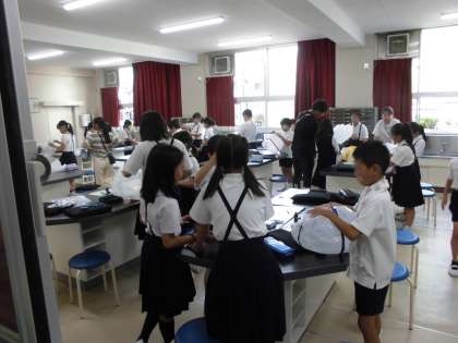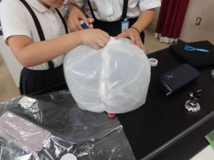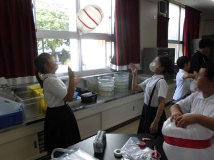 昨日は2学期最初のクラブ活動でした。理科室では「科学クラブ」が活動しています。今回の内容は、ビニル袋が材料の「超はねる!!手作りボール」の作成です。協力して作業を進め、でき上がったボールで楽しく遊んでいました。
