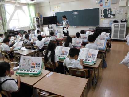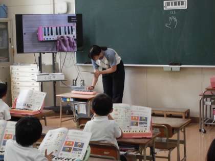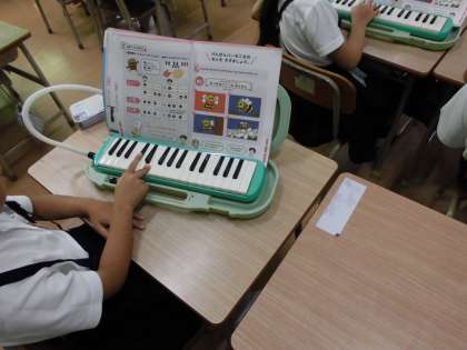 月曜日、1年生が音楽科で鍵盤ハーモニカの練習中でした。大型モニターに写された先生のお手本をもとに指づかいを確認していました。幼稚園や保育園などで経験した子もいますが、みんな一緒にていねいに練習をしていました。音色もそろっていて、素敵でした。