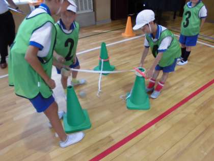 昨日、本校において大阪市で体育科教育を研究されている先生方の研究授業が行われました。2年生が「ぴょん ZOO」という学習で、輪や長縄、ゴムひもを使っていろいろな跳び方をしていました。自分たちでコースを考えて跳んでみる中で、前に跳ぶときや上に跳ぶときに大切なことに気づかせるという内容でした。子どもたちは、グループで相談して用具の置き方を工夫して、楽しく運動遊びに取り組んでいました。