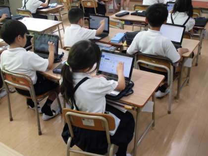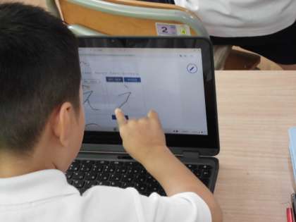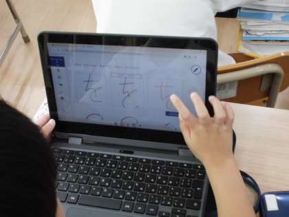 5時間目、1年生がタブレット端末を使って学習していました。自分たちでログインし、デジタルドリルでひらがなやかたかなの練習に取り組んでいました。上手に書けたら、デジタルスタンプやトロフィーがもらえたりします。ついこの間、タブレット端末の使い方を習ったところなのにすいすいと使いこなす姿は、さすが現代っ子という感じです。