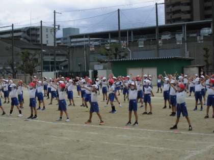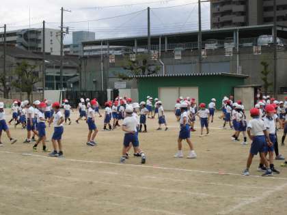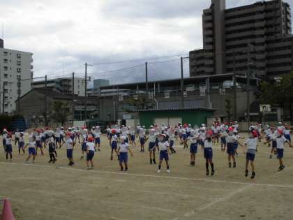 2年生の団体演技の練習です。隊形移動を繰り返し、自分の場所が次々に変わるので場所を覚えるだけでも大変そうに思います。そんな中でも、子どもたちは楽しそうに元気いっぱい身体を動かしています。
