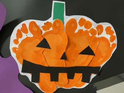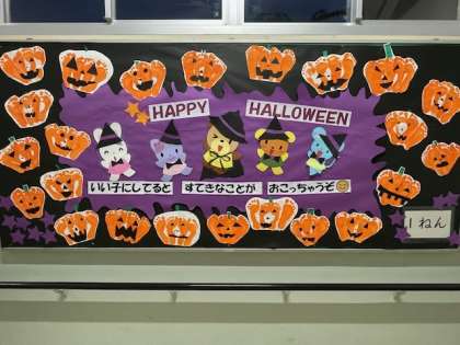 1年生の掲示板がハロウィンのカボチャに模様替えされています。今回も、個性豊かな表情のカボチャがたくさん。よく見るとカボチャの部分は足あとの集まりになっています。足あとの形や大きさも様々です。そのおかげで、カボチャに個性が生まれて魅力が増しているようです。