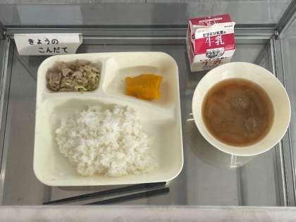 今日の献立は「ごはん・豚肉と野菜の炒め物・いわしのつみれ汁・かぼちゃういろう」です。