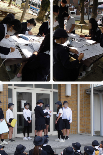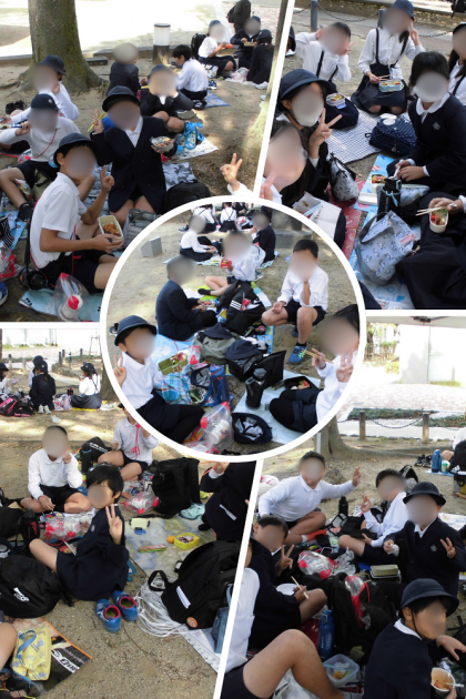 クイズラリーを終えて、昼食時間。グループに分かれて楽しくお弁当を食べました。が、クイズラリーの係は、学校にもどって、表彰式を行うために一生懸命に採点作業です。お疲れまでした。