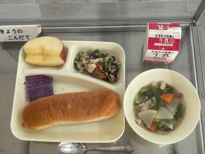 今日の献立は「コッペパン・ブルーベリージャム・ほうれん草のグラタン・てぼ豆のスープ煮・りんご」です。