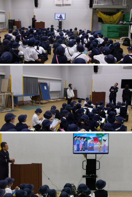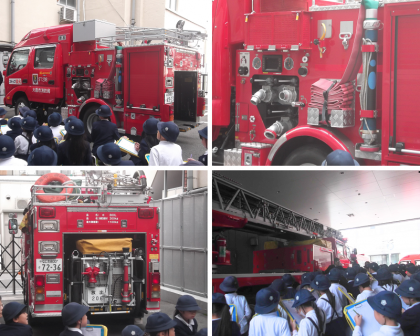 3年生が、城東消防署へ社会見学に行ってきました。署員の方から消防署の仕事などについてビデオを見ながら教えていただいたり、消防車を目の前にして仕組みや働きを教えていただきました。特にはしご車は見るからに迫力満点で、子どもたちの興味関心をひいたようです。