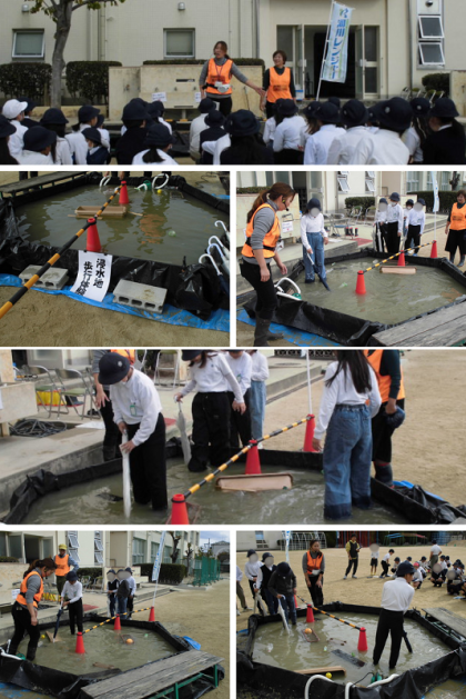 運動場では、浸水した道路を歩く「浸水地歩行体験」をしました。水の深さは15センチメートルほどですが、濁っていて地面の様子は見えません。手に持った傘で自分の足元を確認したり、流れてくる障害物をよけたりしながらそろりそろりと歩きます。また、マンホールのふたがずれたり、外れていたりするとはまってしまうので、これも注意しなければいけません。子どもたちは「歩きにくかった」「気持ち悪かった」と言っていました。