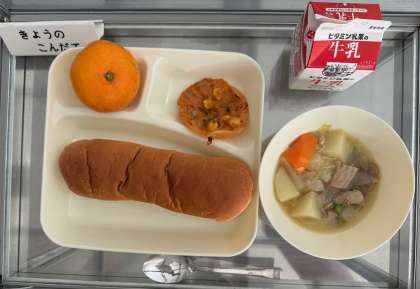 今日の献立は「黒糖パン・豚肉と野菜のスープ・変わりピザ・ミカン」です。