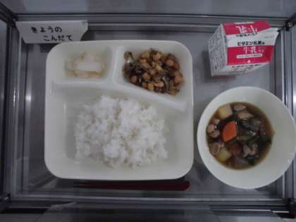 今日の献立は「ごはん、鶏肉と野菜の煮物、じゃこ豆、かぶのゆず風味」です。