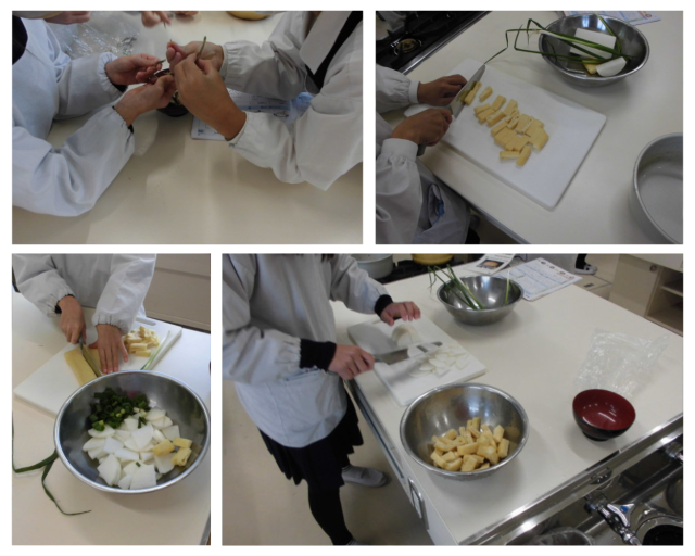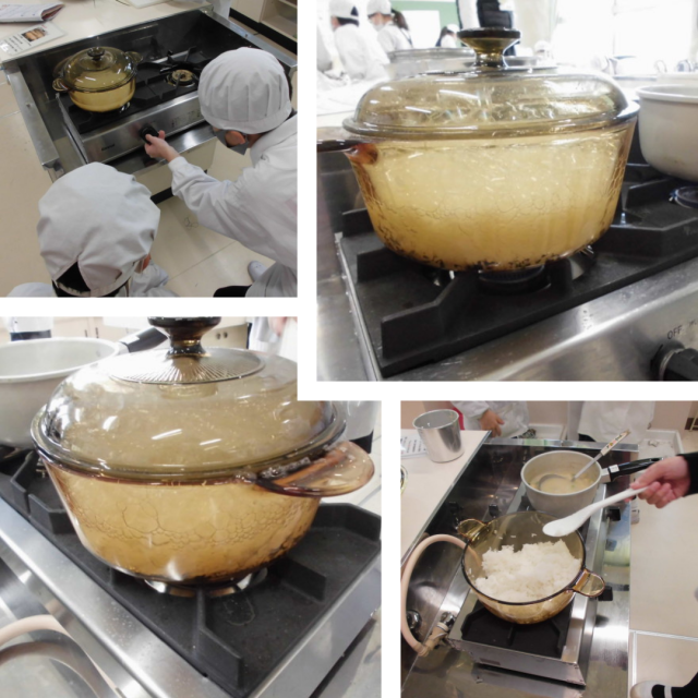 めあては「和食の基本となるごはんとみそ汁を作ろう」でした。ごはんは、透明なキャセロールで炊き上げます。火をつけ、しばらくすると煮立ってあぶくが出てきます。透明なので、その様子もよく分かります。みそ汁は、煮干しでだしを取り、大根、うす揚げを具材とし、青ネギを散らします。どの班も手分けをして、順序良く作業を進めていました。大根やうす揚げを切る場面では緊張している様子もありましたが、みんな楽しそうに参加していました。炊き上がったご飯にはおこげもできていて香ばしい香りがしていました。みそ汁は、煮干しの出汁がよく出ていて美味しそうでした。実際に食べても「めっちゃおいしい!」という声があちらこちらから上がっていました。
