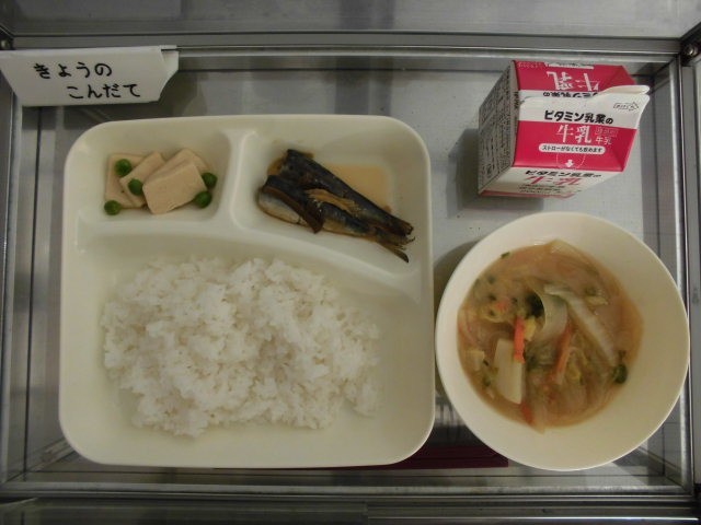 今日の献立は「ごはん、いわしの生姜煮、みそ汁、高野豆腐の煮物」です。