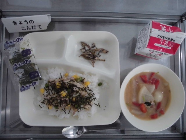 今日の献立は、正月の行事献立「れんこんのちらし寿司、刻みのり、雑煮、ごまめ」です。