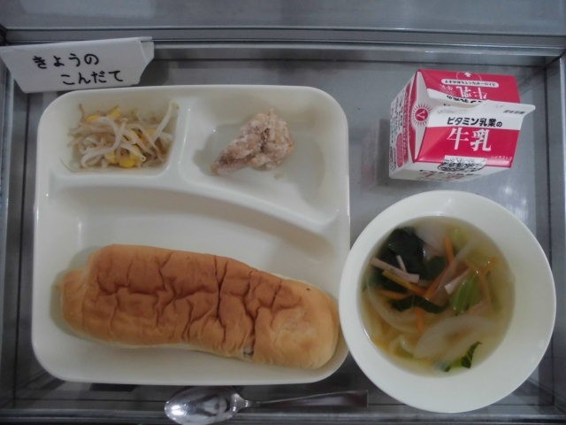 今日の献立は「おさつパン、鶏肉のから揚げ、ハムと野菜の中華スープ、もやしとコーンの中華和え」です。