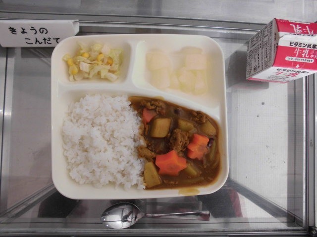 給食のカレーライスやハヤシライスなどには「ラッキーにんじん」が入っています。新年最初のラッキーにんじんをゲットした人は、気持ちの良いスタートが切れたことと思います。また、きょうのカレーライスには、金時豆が入っています。豆は栄養価が高く、あっさりとした味わいやほくほくした食感が楽しめるメニューでした。