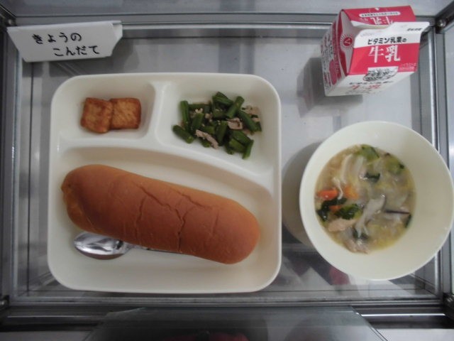 今日の献立は「黒糖パン、白菜のとろみ煮、厚揚げのピリ辛醬油かけ、豚肉と三度豆のオイスターソース炒め」です。