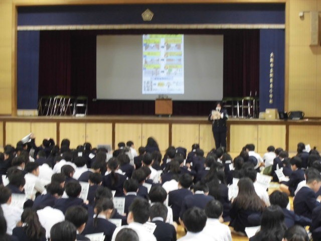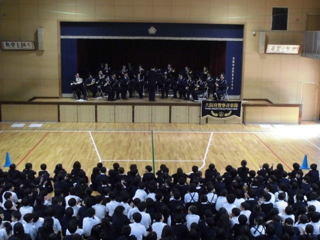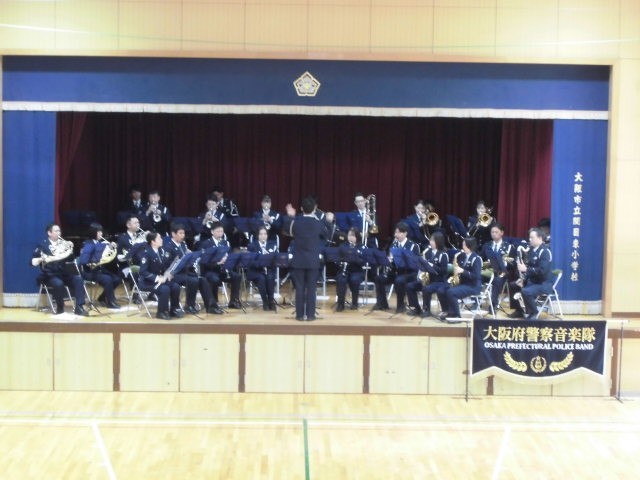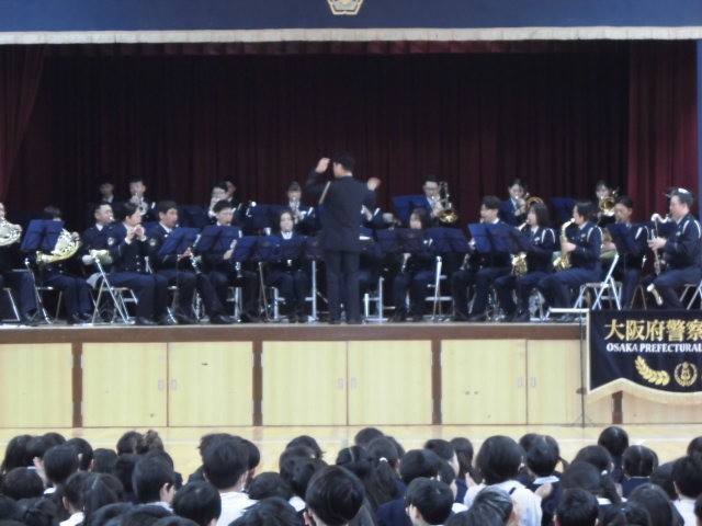 今日は、城東警察署・交通課の方と大阪府警察音楽隊の方々に来ていただき、交通安全教室と音楽鑑賞を行いました。